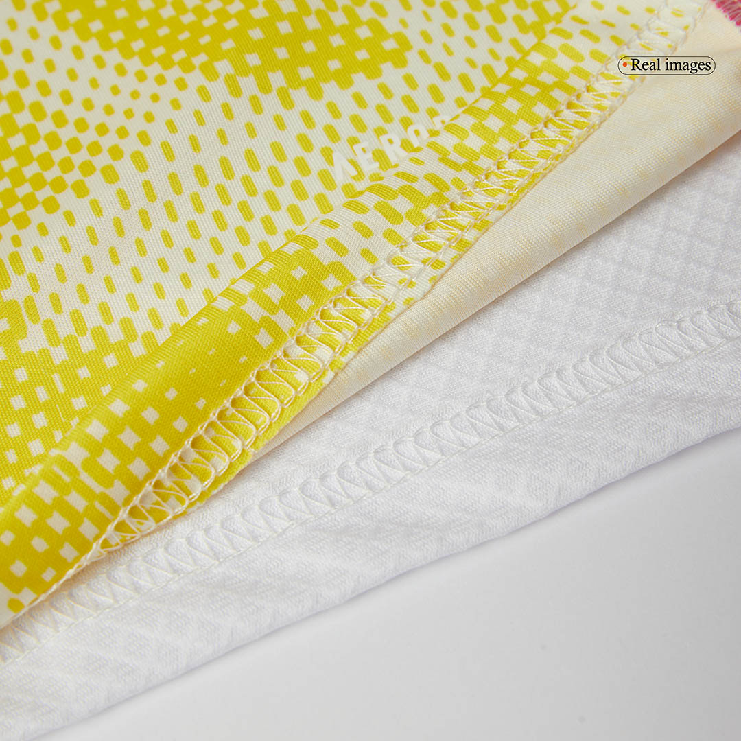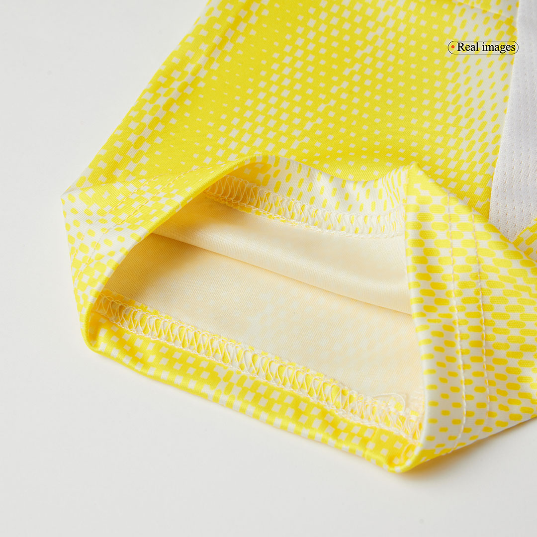 The main color of the Juventus 24-25 third kit is solar yellow with the Brand logo, the Juventus crest, and the three stripes on the shoulders in dark grey.