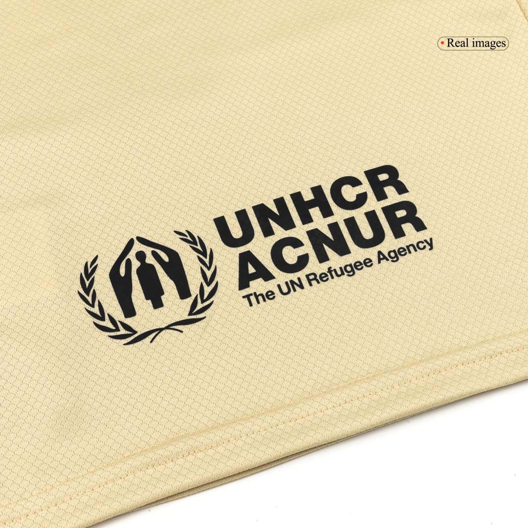 The 25/26 Barcelona kids jersey features the same light yellow-gold base with striking black and Persian violet accents. Its collar and cuffs reflect the style of the iconic NBA Lakers, blending basketball heritage with Barça pride. The Barcelona football jersey crest carries a subtle snake-skin pattern to honor Kobe’s famous “Mamba Mentality,” making this kit a symbol of ambition and excellence.