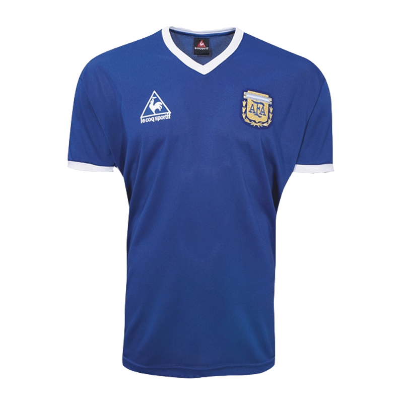 TheDiego Maradona 1986 Argentinashirthas a blue background and is very simple and clean.Presents the LE COQ SPORTIF logo stamped and the embroidered Argentina AFA crest.On the left chest is the AFA emblem of the Argentine football team and on the right chest is the embroidered Le Coq Sportif logo, the manufacturer of the shirt.