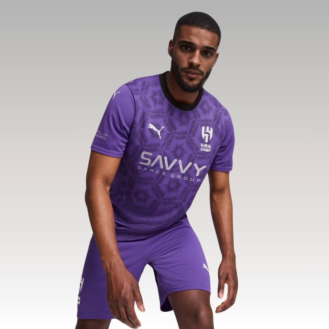 Details of the jersey: Description about the Al Hilal SFC Third Away Soccer jersey: Al Hilal SFC Third Away Jersey 2024/25 OUT NOW! The Al Hilal SFC replica football jerseys are for the Saudi Professional League next season. And the Al Hilal SFC jersey will be worn by the likes of Neymar, João Cancelo, Rúben Neves, Sergej Milinković-Savić, Kalidou Koulibaly and Renan Lodi. The Al Hilal SFCreplica football jersey aredominated by the colour purple and incorporates a design with a hexagonal pattern and thin border on the front. White detailing has also been added throughout the black Al Hilal SFC jersey, applied to the text and sponsor logo and team badge. Additionally, the only black colour is applied to the round collar of this Al Hilal SFC jersey. 2024/25 Al Hilal SFC jersey features a unique sublimated pattern on the front, adding depth and visual interest to the design.