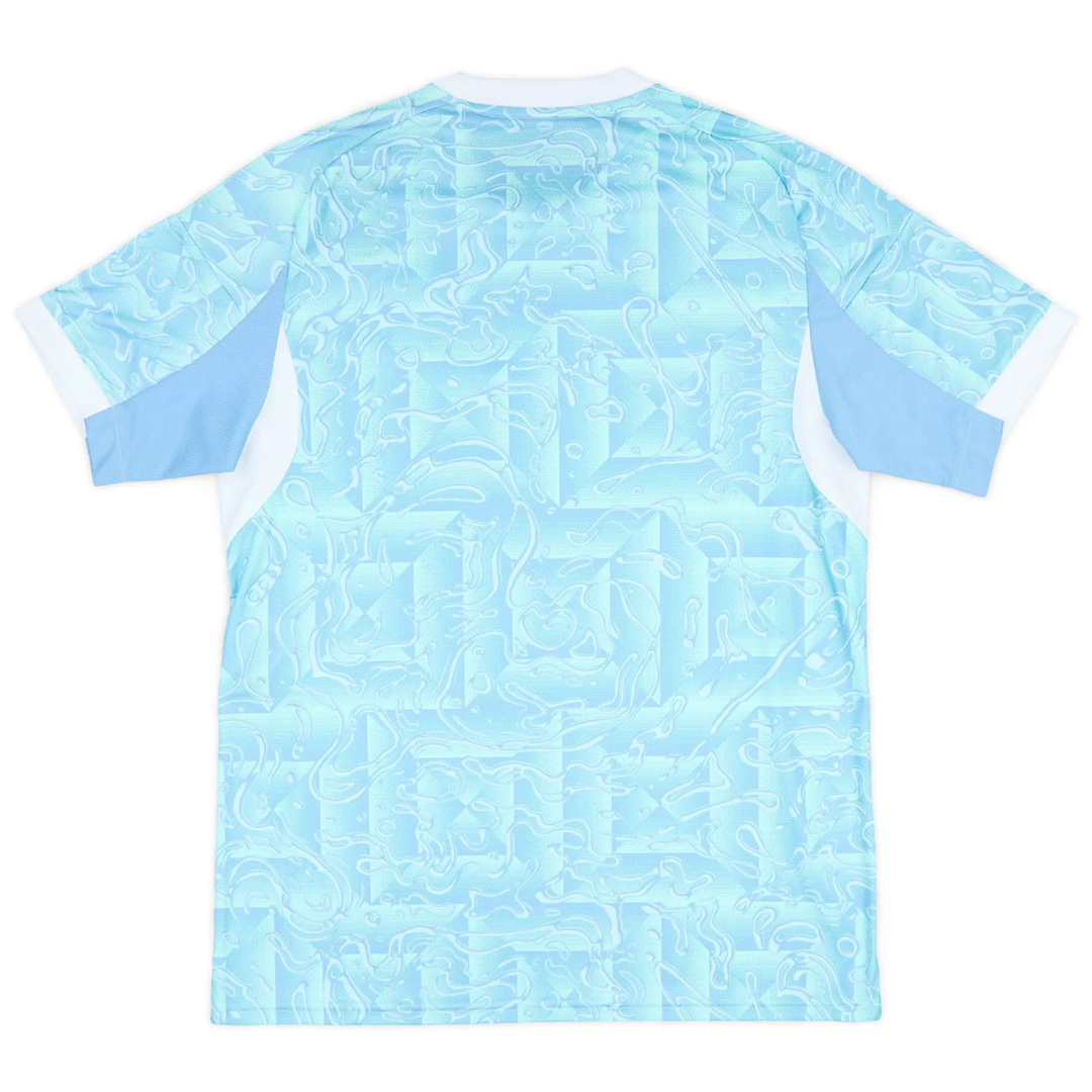 The Adidas Juve 2025-2026 away football shirt is predominantly light blue, with white logos and light citrus yellow details.