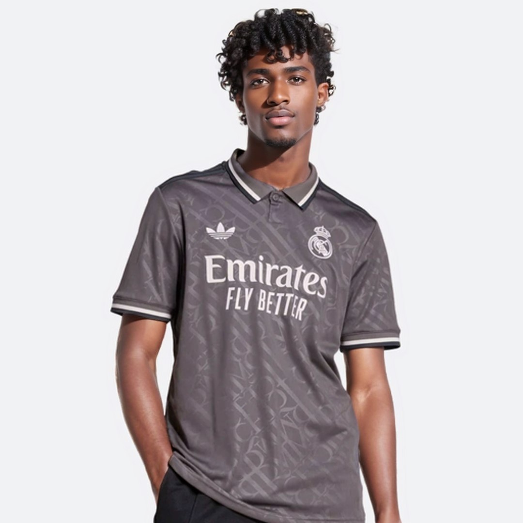 Description about the Real Madrid jersey: The 2024-25 Real Madrid third kit will showcase an elegant color scheme of grey, black, and white. The Real Madrid jersey will introduce a unique polo neck collar, a feature typically reserved for its Originals line. Notably, the Real Madrid shirt will incorporate a subtle yet striking detail: the ‘RMCF’ emblem from the club badge will be embossed on the fabric, creating a shimmering effect when illuminated. These embossed monograms, inspired by traditional Madrid street signage, will adorn the  Real Madrid  jersey, adding a touch of sophistication.